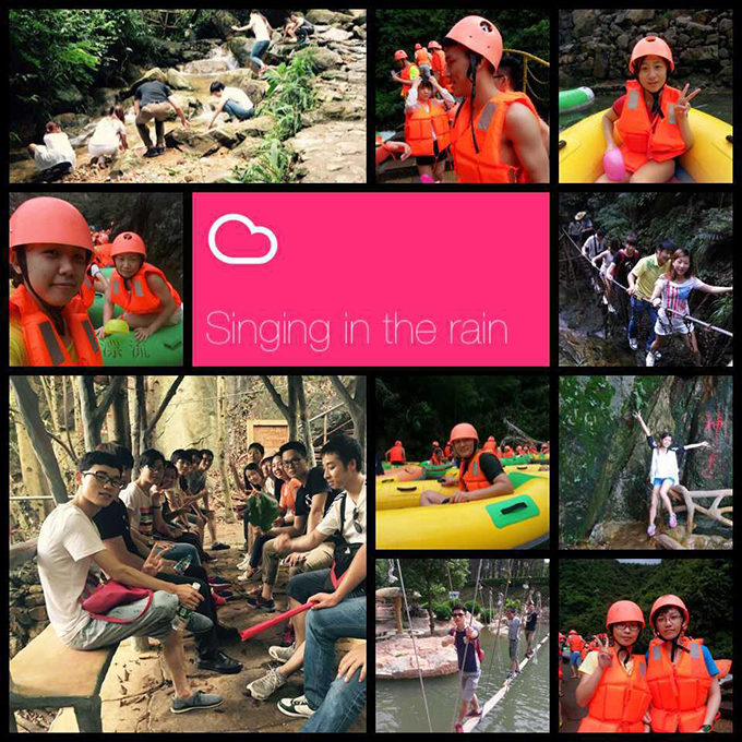 青山绿水间,转瞬飞流冲水六公里。两人面对面坐在橡皮艇上,戴着头盔,穿上救生衣,由上而下,九转曲折漂流而下,时而惊叫,时而欢呼。你一艇,我一组,大家都在争相组合,还没有开始漂流的时候,我们就已经开始用手中的水瓢互相泼水了,无形中同事与同事之间的感情、互动更加深厚。在整个漂流的过程中,除了下落的时候要抓紧橡皮艇之外,主要就是游客之间互相泼水。往往上游被人泼水吃亏了,就在下游装好一水瓢水等着他们的到来,趁他们还没有从紧张的漂流中缓过气来,兜头就是一瓢水泼过去。同事们在各种惊叫声和各种欢笑中结束了漂流。漂流不仅要受得了水冷,还要经受水的冲击,水的洗礼,多么不容易。一种锻炼,一种体验,人生也不过如此,困境时磨难,浪静时享受,人在旅途,玩在途中,乐在其中。