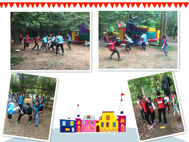 吃饱攒足精力开始玩“撕名牌”的游戏啦,依旧是分成红蓝两队,大家玩的可开心了,笑声不断^_^