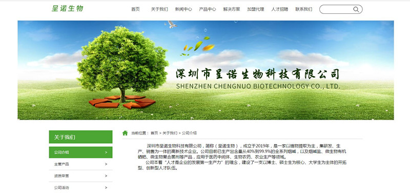 深圳市呈诺生物科技有限公司,简称(呈诺生物),成立于2019年,是一家以植物提取为主,集研发、生产、销售为一体的高新技术企业。公司目前已生产出含量从40%到99.9%的全系列烟碱,以及烟碱盐、微生物有机硒肥、微生物复合菌剂等产品,应用于医药中间体、生物农药、农业生产等领域。