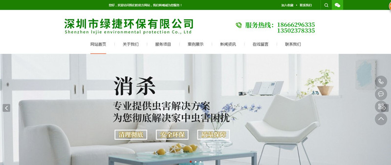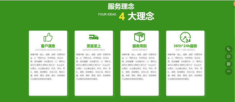 绿捷本着“诚心、诚意、诚信”的服务宗旨,以“预防为主、科学防控、依法治理、促进健康”为经营方针,以“博学之,审问之,慎思之,明辩之,笃行之”为企业文化理念,为企事业单位、机关、学校、军队、医院、旅游景区、住宅小区、商住大厦、宾馆、酒店、餐馆、超市、轮船等各行业提供优质良好的服务。