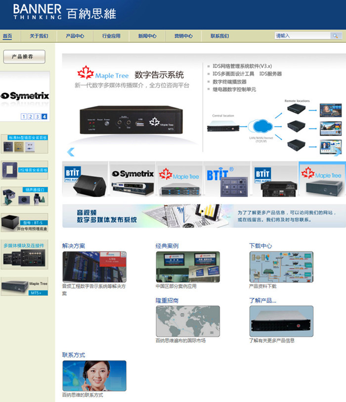 深圳百纳思维科技有限公司(Banner Thinking Technology)成立于2007年,是由多名服务于音视频、数字多媒体发布系统行业多年的资深技术工程专家共同发起投资组建成立的。公司从事产品销售、设计开发以及运营服务,主要销售专业音视频产品和美图数字告示系统、多媒体发布系统产品,同时提供数字多媒体发布系统的运营服务。