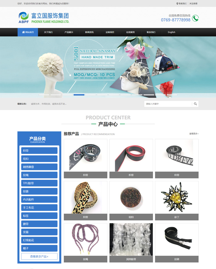 富立国服饰集团成立于1999年,二十多年来,我们专注服装配料及原材料的研发、设计、生产、销售和服务。公司为提供快捷,高质量并具有强竞争力的产品,自购工业用地,投资五家工厂,分别生产:绳带、织带、松紧带、腰带、纽扣、刺绣、手工、蕾丝花边、内衣辅料等。