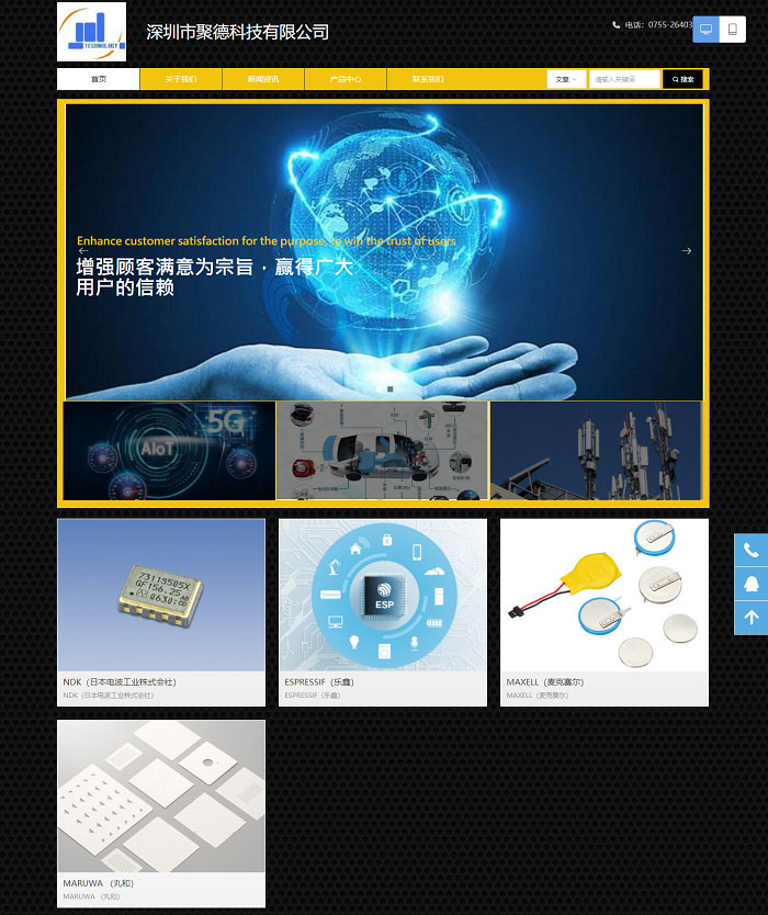 深圳市聚德科技有限公司成立于2006年,公司是一家电子元器件代理、分销商。目前代理多个国外知名品牌器件,日电波株式会社(NDK)晶振,麦克赛尔电池(MAXELL)日本丸和(MARUWA)乐鑫(ESPRESSIF)模块等品牌产品,多年来一直致力于电子元器件的销售、推广工作,以及为客户提供技术支持,设计方案为一体的多元化的经销商。公司专业经营各类电子元器件:集成电路IC、磁簧开关、继电器、传感器和频率元件。公司和世界许多著名的元器件厂商有着长期的合作关系。