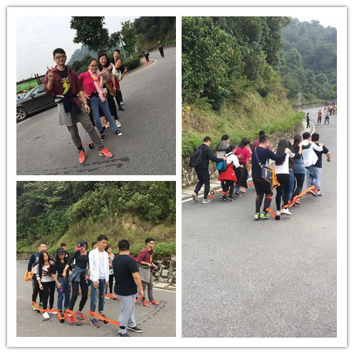 走到半山腰我们就开始玩游戏啦,六人七足游戏的规则是把先同事们分成两组,然后统一用一根绳子绑住右脚,这样先到达终点的一支队伍为之胜利。这个游戏充分的体现了同事之间的默契和协调性,最后到达的一队待会在烧烤的时候负责烧食物给我们吃的哦,谁输谁赢呢,让我们拭目以待吧~~!