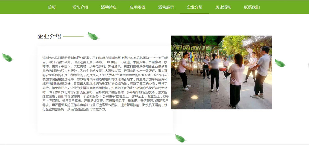 深圳市名马轩活动策划有限公司率先于14年就在深圳市场上推出农家乐休闲这一个全新的项目。得到了诸如华为、比亚迪富士康、华为、TCL集团、比亚迪、中国人寿、中国移动、康师傅、完美(中国)、天虹商场、沙井电子城、黑谷通讯、森密科技等众多知名企业提供专业的培训服务和乡村服务,为各企业的发展壮大添砖加瓦,得到参训客户一致好评。