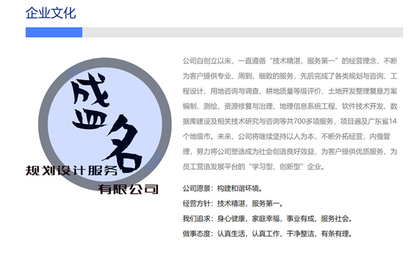 公司自创立以来,一直遵循“技术精湛、服务第一”的经营理念,不断为客户提供专业、周到、细致的服务,先后完成了各类规划与咨询、工程设计、用地咨询与调查、耕地质量等级评价、土地开发整理复垦方案编制、测绘、资源修复与治理、地理信息系统工程、软件技术开发、数据库建设及相关技术研究与咨询等共700多项服务,项目遍及广东省14个地级市。