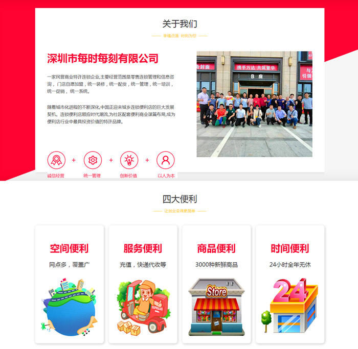 深圳市每时每刻便利店有限公司一家民营商业特许连锁企业,主要经营范围是零售连锁管理和信息咨询, 门店自愿加盟,统一装修,统一配货,统一管理,统一培训,统一促销, 统一系统。