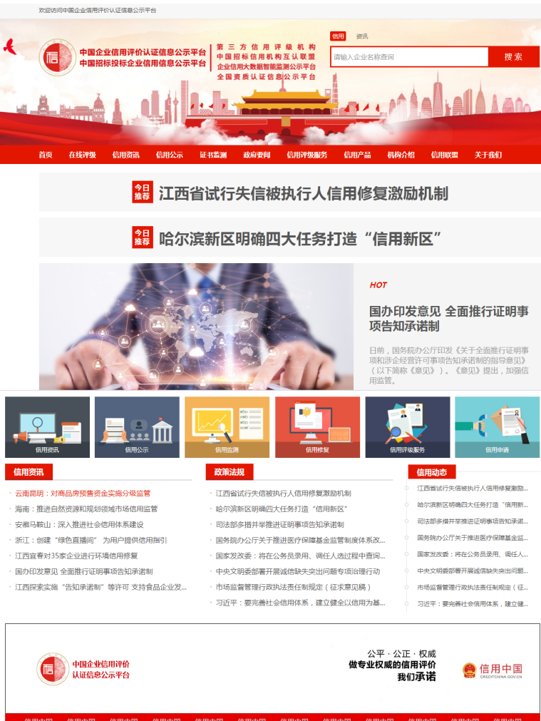 为推动社会信用体系建设工作的开展,鼓励具备资质、满足要求的专业机构采用公平、科学、权威的评价标准,对受评组织的基本素质、经营状况、财务状况、盈利能力、管理能力和发展前景等方面进行综合分析和评价,国家发改委主管的中宏网与中国招标投标公共服务平台联合推出“中国企业信用评价认证信息公示平台”。